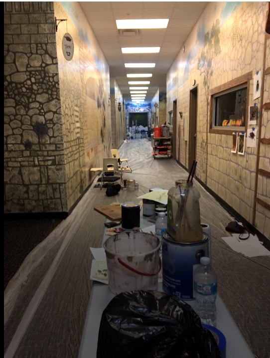 Completed December 2020, a three year project using only volunteers. The majority of volunteers had little or no experience, but were assessed for their style and preferences and put to work on the mural layers. Most of the workers were continually assessed while working on the base colors and stonework to create a visual city. Those who had the time and skills developing continued on to more complicated scenes as their time and desires allowed. Meanwhile, Kenna Boles Prior and Casey Parrott, lead artist continued their own work on the mural.